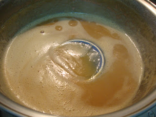 Coloque os ingredientes em uma panela (precisa ser uma panela bem alta, pois a calda sobe muito). Mexa e quando estiver para ferver não mexa mais. Tome cuidado para não sujar as laterais da panela pois a calda pode açucarar.